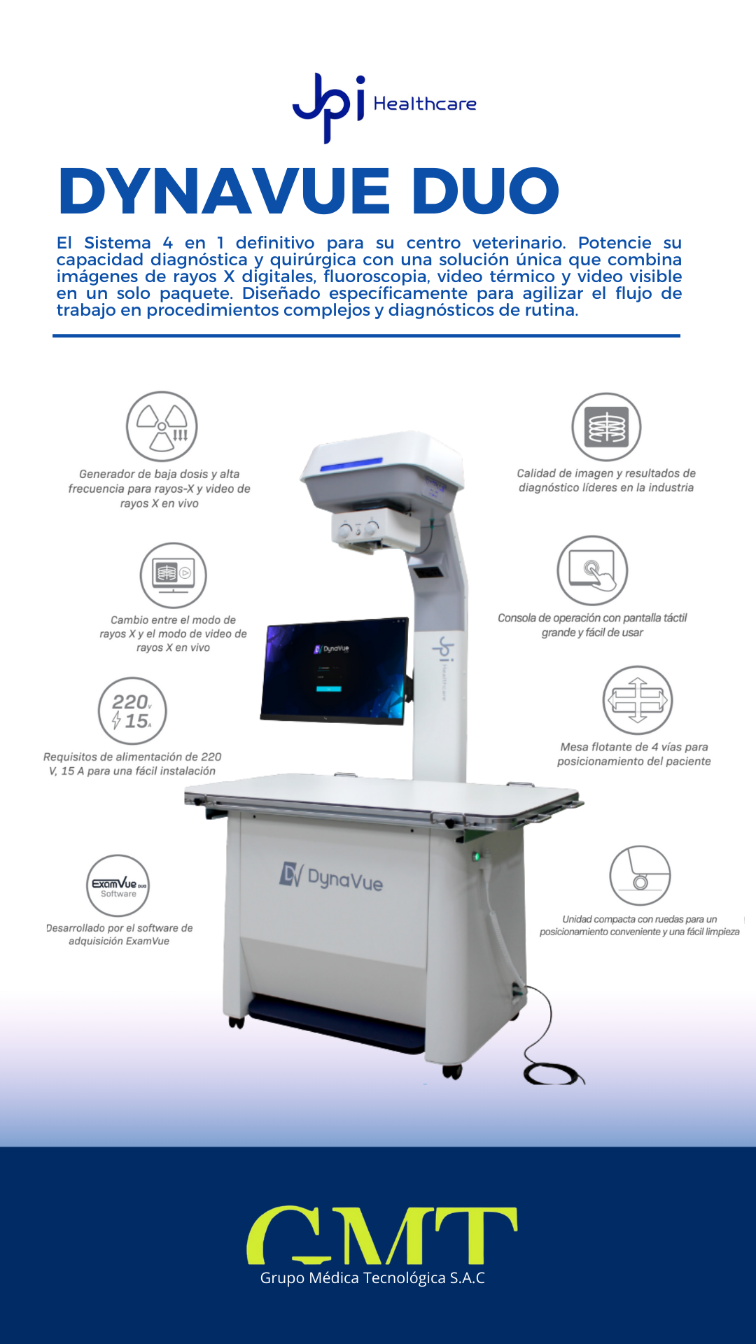 El Sistema 4 en 1 definitivo para su centro veterinario. Potencie su capacidad diagnóstica y quirúrgica con una solución unica que combina imágenes de rayos X digitales, fluoroscopia, video térmico y video visible en un solo paquete, Diseñado específicamente para agilizar el flujo de trabajo en procedimientos complejos y diagnósticos de rutina.