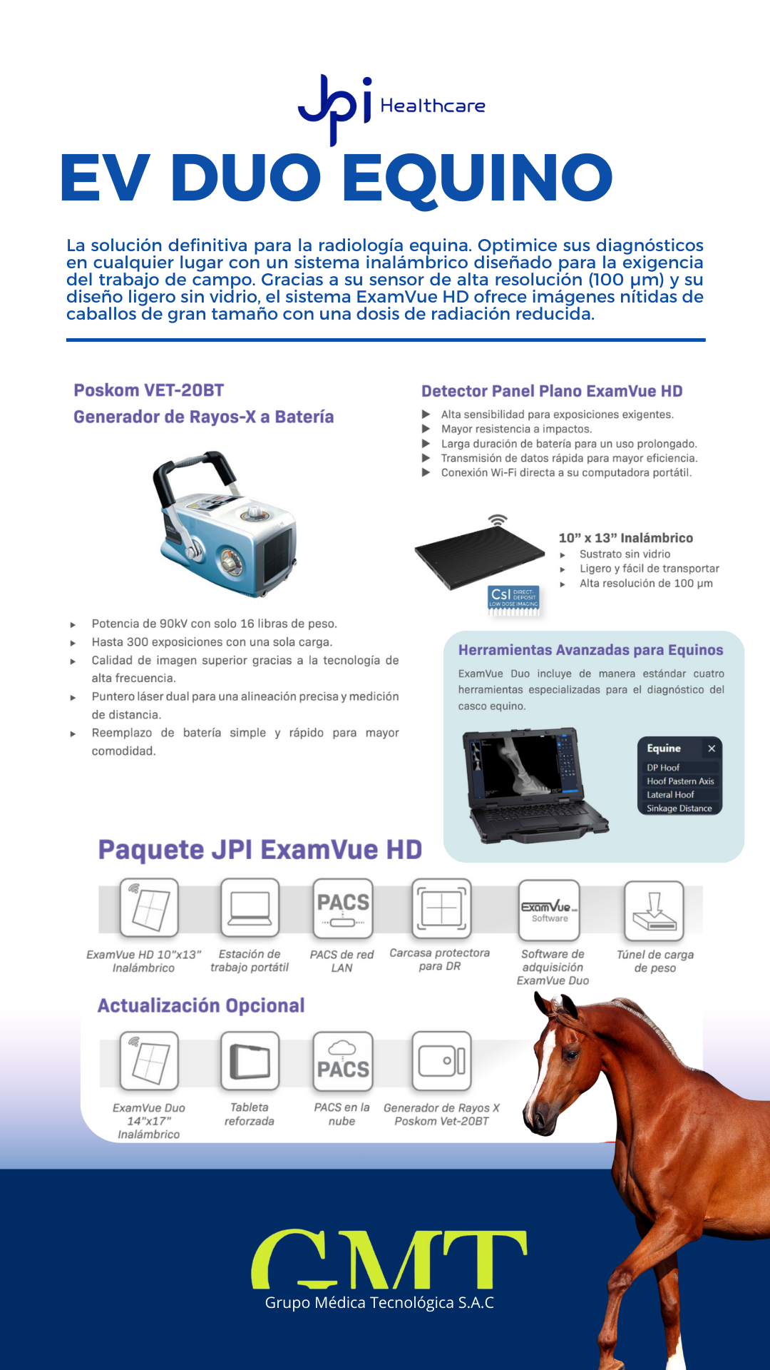 La solución definitiva para la radiología equina. Optimice sus diagnósticos en cualquier lugar con un sistema inalámbrico diseñado para la exigencia del trabajo de campo. Gracias a su sensor de alta resolución (100 um) y su diseño ligero sin vidrio, el sistema ExamVue HD ofrece imágenes nítidas de caballos de gran tamaño con una dosis de radiación reducida.