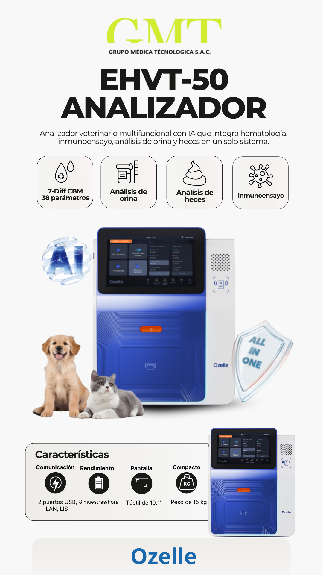 El EHVT-50 de Ozelle es un analizador multifuncional para veterinaria impulsado por inteligencia artificial. Este equipo integra capacidades avanzadas de hematología de 7 diferenciales, análisis de orina, análisis de heces y ensayos inmunológicos en un solo dispositivo.