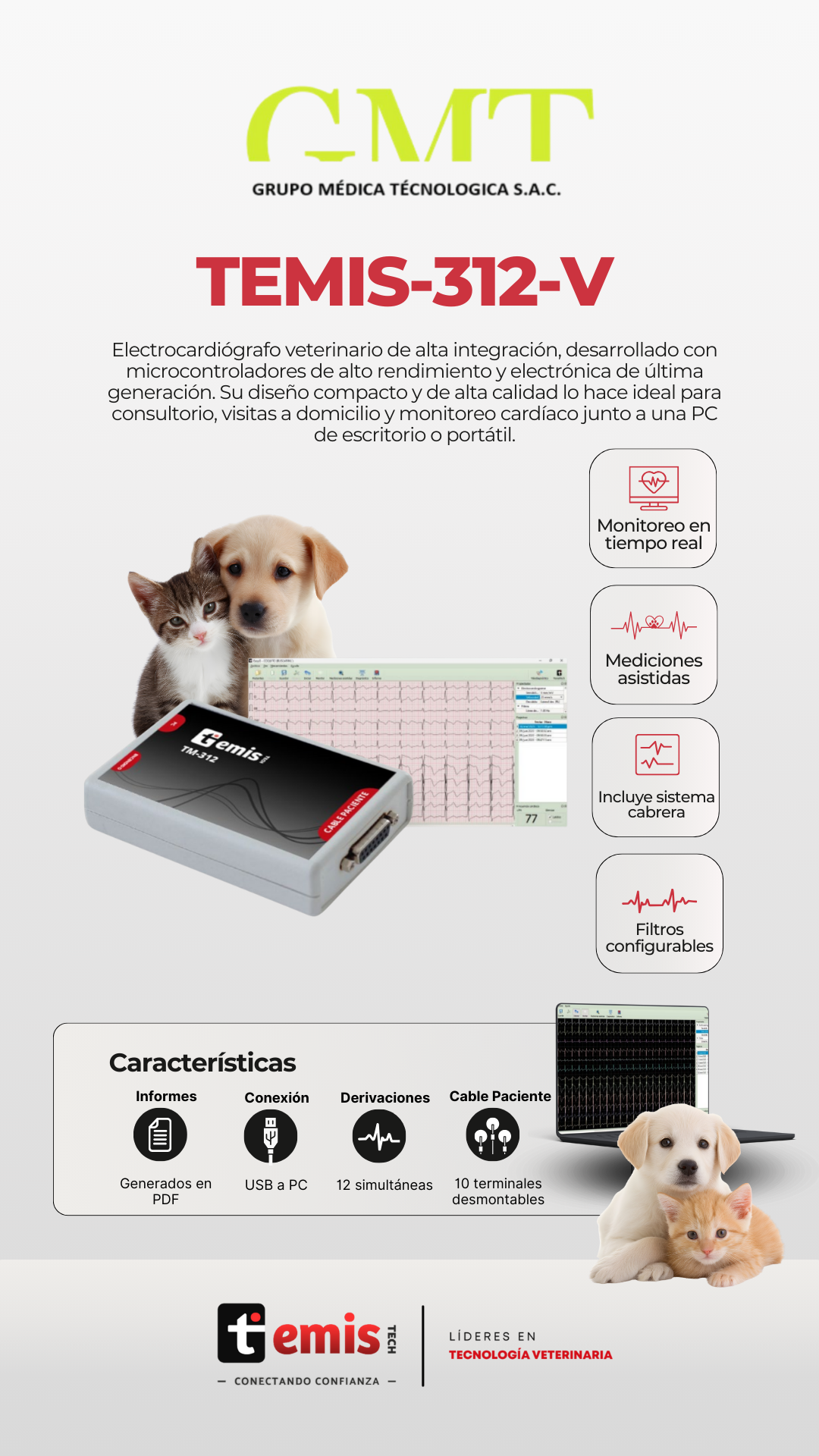 Electrocardiógrafo veterinario de alta integración, desarrollado con microcontroladores de alto rendimiento y electrónica de última generación. Su diseño compacto y de alta calidad lo hace ideal para consultorio, visitas a domicilio y monitoreo cardíaco junto a una PC de escritorio o portátil.